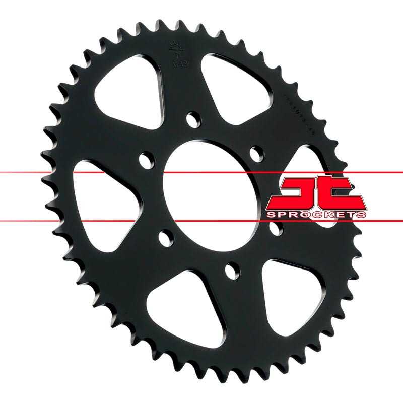 Piñón y corona JT Sprockets, fabricados en acero al carbono de alta resistencia. Puedes variar el número de dientes y el tipo de piñón en el desplegable. Enviaremos la cadena cortada a medida según tu elección.